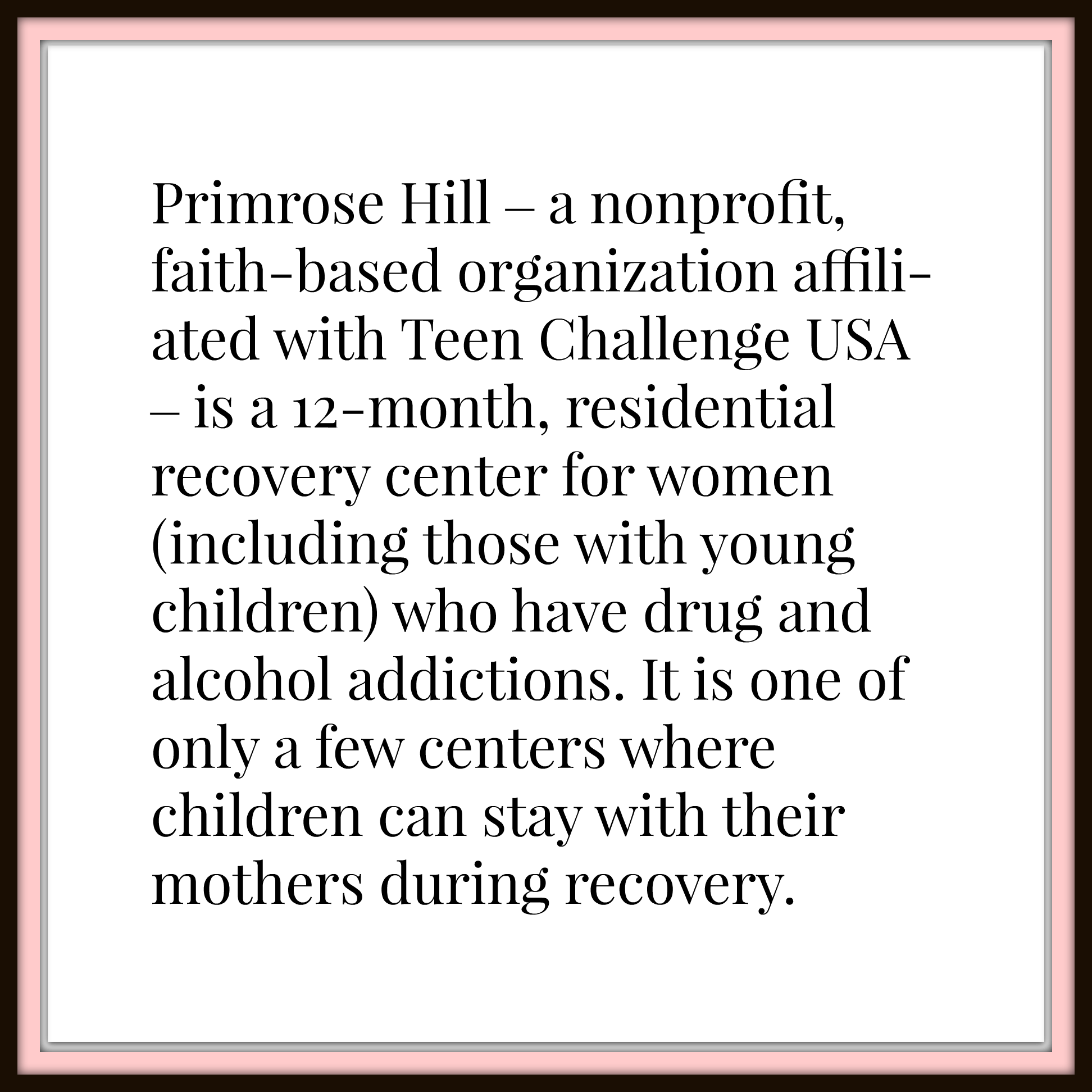 It takes about $2,000 per mom and $100 per child each month to operate the Primrose Hill recovery center. I hope you can help, and I know the families will be eternally grateful.